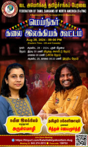 எதிர்வரும் ஆகஸ்ட் மாதம் 28ஆம் நாள், புதன்கிழமை இரவு, கிழக்கு அளவீட்டு மணி 9, பசிபிக்நேரம் மாலை 6 மணி, இந்திய நேரம் ஆகஸ்ட் 29, காலை 6.30 அளவில், வட அமெரிக்கத் தமிழ்ச்சங்கப் பேரவையின், “கலை இலக்கியக் கூட்டம்” இணையவழியில் நிகழவுள்ளது. அக்கூட்டத்தில், “தமிழும் மக்களிசையும்” எனும் தலைப்பில் பாடகர், இசையமைப்பாளர், முனைவர் சித்தன் ஜெயமூர்த்தி அவர்களும், “நவீன இலக்கியம்” எனும் தலைப்பில் எழுத்தாளர் அருள்மொழி அவர்களும் நம்மிடையே உரையாற்றவுள்ளனர்.