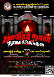 வடஅமெரிக்கத் தமிழ்ச்சங்கப் பேரவை சார்பாக “மாவீரர் நாள் நினைவேந்தல்” வரும் மாவீரர் நாளான நவம்பர் 27 ஆம் தேதி, இரவு 9 மணிக்கு (கிழக்கு சீர்தர நேரம்) இணையம் மூலமாக நடைபெற உள்ளது. நம் தமிழீழ மண்ணின் விடுதலைக்காக வீரமரணம் அடைந்த அனைத்து மாவீரர்களுக்கும் இந்த நினைவேந்தல் நிகழ்வில் அகவணக்கம் செலுத்தப்படும். இந்த நிகழ்வில் சிறப்புரையாற்ற இலங்கையில் இருந்து ஈழத்தமிழர் சுயாட்சிக் கழகத்தின் செயலாளர் திருமிகு.அனந்தி சசிதரன் அவர்களும், தமிழ்நாட்டில் இருந்து தமிழ்த் தேசியப் பேரியக்கத்தின் தலைவர் திரு.பெ.மணியரசன் அவர்களும் இணைகிறார்கள்.
